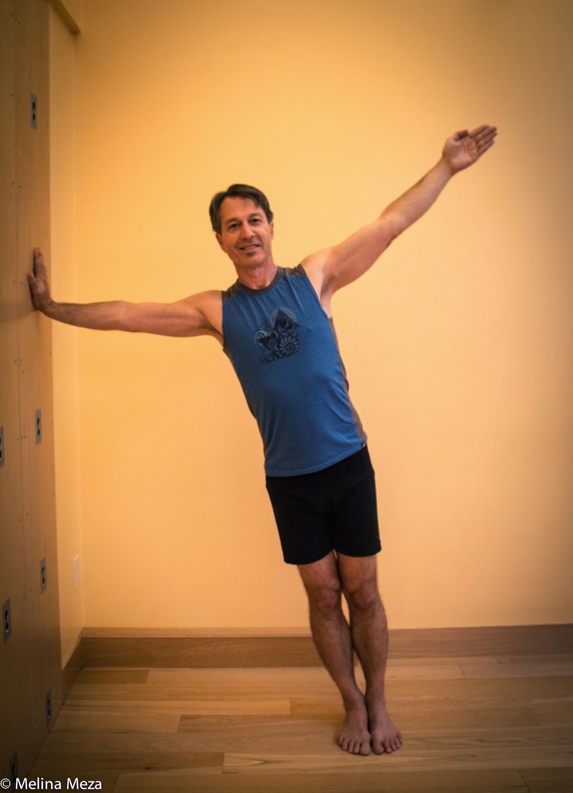 In this pose, I like to think about pressing my inner hand into the wall, spreading my collarbones and ribcage away from that arm, and letting the energy circle through my chest and out through the fingers of my raised arm. Keep your neck soft as you work with your arms and shoulders.