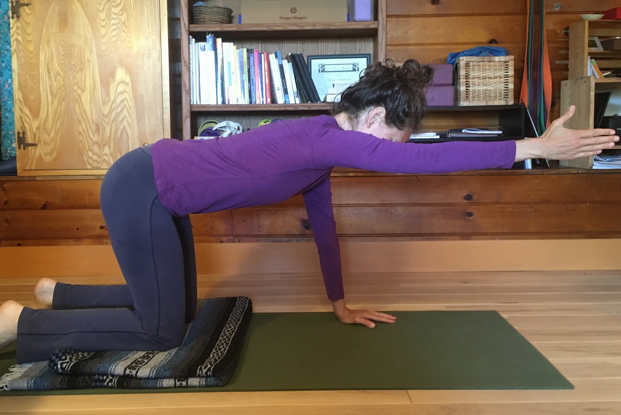 You can do the classic pose as described above with just the arm lifted instead of both the leg and the arm. This is a good option if you’re dealing with low back pain. It works the shoulder and mid-back, offering some stability and strengthening, without aggravating the lower back muscles needed to lift the leg.