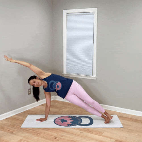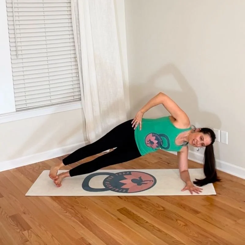 Our goal in this side plank variation is to maintain our balance in side plank while we tap our elbow to our knee.