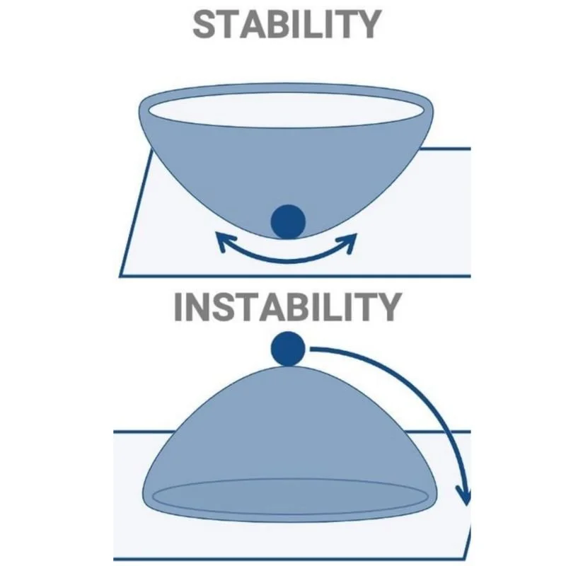 On the flipside, picture an upside-down bowl with a marble resting on top of it. This system is inherently unstable because the slightest perturbation would cause the marble to roll to the side and off the bowl. There’s no way it would return to its original position on top of the bowl on its own.