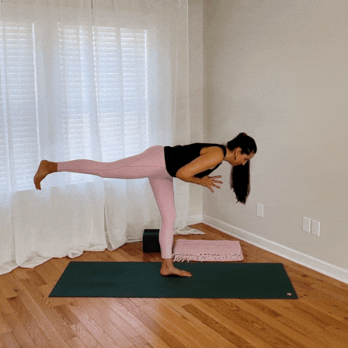 In order to transition into half moon from warrior 3, we rotate our torso to the side so that our hips stack. (The yoga world calls this an “open hip” position.)