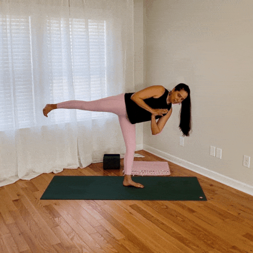 In this variation, we transition from half moon to warrior 3 and back again, rotating at our standing hip joint: