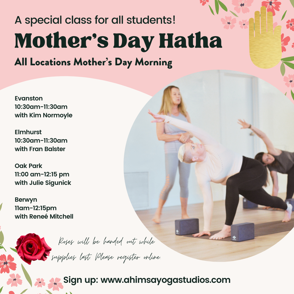 Celebrate Mother’s Day with our special Hatha yoga classes at all Ahimsa Yoga Studio locations, also available via live stream. Join us for a Hatha session led by our incredible teachers, who are thrilled to offer this exclusive experience.