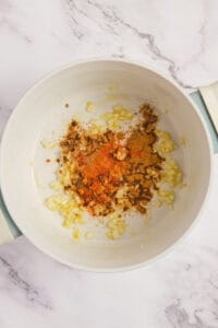 Cook onions and garlic; add spices.