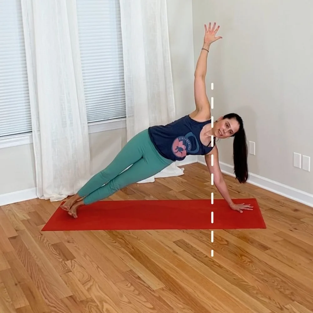 Biomechanically, side plank is a pose that targets the shoulder in a position of abduction. But think about the strength training world’s full range lateral raise, which also targets the shoulders in abduction – but through a full range of this direction of movement: