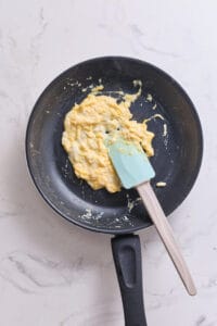 Add the beaten egg into the pan and scramble it, seasoning with salt and pepper to taste and stirring to prevent it from sticking.