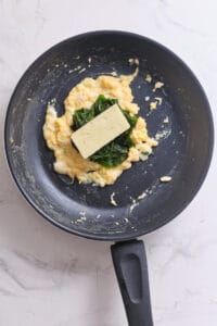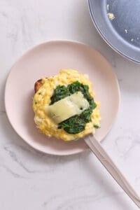 Transfer the cooked scrambled egg, spinach, and cheese to the bottom half of the bun or muffin.
