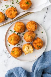 If you’d like to prep these bites in advance, follow the recipe and stop when you get to the step where you fry them. You can store them in the fridge for up to 3 days or in the freezer for up to 2 months. Simply fry them when you’re ready to serve. Once you’ve cooked the mac and cheese bites, any leftovers should be allowed to cool and then be stored in an airtight container for up to 3 days in the fridge. You can also store them in a freezer-safe container and freeze for up to 2 months. To reheat, bake them for 10 to 15 minutes in the oven at 350° F.