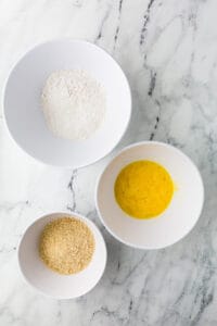 Set up three shallow bowls: one with flour, one with beaten eggs, and one with panko breadcrumbs.