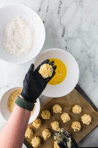 Form the chilled mac and cheese into 1.5-inch balls. Place on a tray and refrigerate while setting up the breading station.