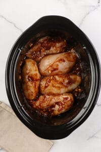 Place chicken breasts in the crock-pot and pour the sauce over them, ensuring they are well coated. Cover and cook on low for 4 hours.