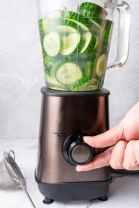 In a blender, combine the chopped cucumbers, sugar, lime juice, and 2 cups of water. Blend until smooth.