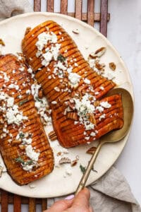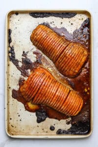 While I love everything sweet, many people, including my kids, prefer the savory route. A brown butter sage version is an excellent alternative for the maple syrup mixture. Melt 4 tablespoons of butter in a small saucepan over medium heat and whisk it continuously for 2 to 3 minutes. Remove the pan from the heat once you see brown bits on the bottom. Stir in 1 1/2 teaspoons of ground sage and a pinch of nutmeg, and brush it over the squash. Sprinkle fresh chopped sage on at the end. You can also add caramelized onions or shallots to the butter.
