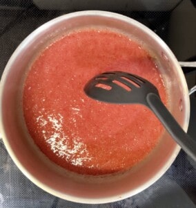 Transfer to a large pot and bring to a boil on high heat. Once boiling, reduce to medium and simmer, stirring very frequently, until it is reduced by half. You should have just under 1 1/4 cups of purée after reducing. This takes 15 to 25 minutes, depending on how big your pot is.