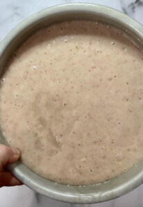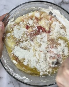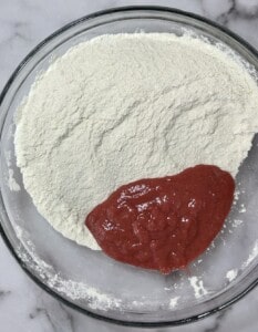 In a large bowl, whisk the flour, sugar, baking powder, soda, and salt. Push the mixture to the side of the bowl and spoon in just under 1 cup of the strawberry purée, but don’t mix it.