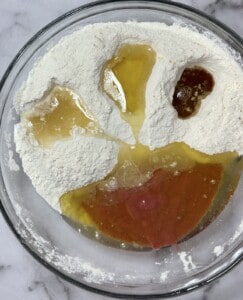Make three wells in the flour. In one, pour the vanilla, in one the vinegar, and in one the oil. Don’t mix.