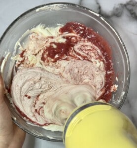 Add the remaining strawberry reduction and beat until well mixed.