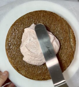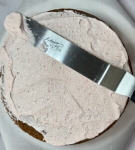 Place one of the cake layers on a cake stand, bottom side up and spread 3/4 cup of the frosting on top.