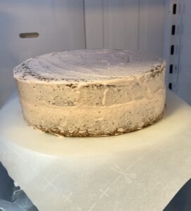 Place the other cake on top. Spread a very thin layer of frosting over the cake to seal in the crumbs, then chill for 30 minutes.