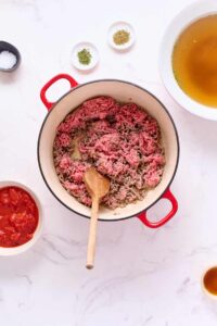 In a large pot, cook ground beef over medium heat until browned. Drain excess grease.