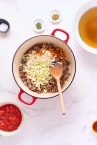 Yes! To make this soup vegetarian-friendly, replace the beef with a plant-based ground beef substitute, such as “Impossible” or “Beyond” brands. You can also replace the beef with lentils or noodles. Also, swap out the beef broth for vegetable broth, and omit the Worcestershire sauce.