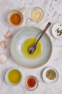 In a large mixing bowl, combine olive oil, lemon juice, Dijon mustard, red wine vinegar, honey, minced garlic, Italian seasoning, salt, and black pepper.