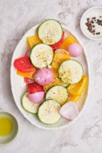 In a separate bowl, combine zucchini, bell peppers, and red onion with a drizzle of olive oil and a pinch of salt and pepper to taste. Toss to coat.