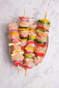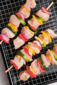 You can make the marinade and chop the vegetables up to 24 hours in advance. After cooking, if you have leftovers, store them in an airtight container in the fridge for 3-4 days. Kabobs can also be frozen—just remove them from the skewers first and store them in a freezer-safe bag for up to 2 months.
