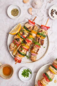 Kabobs are also great for dipping. They’re perfect with a classic Tzatziki Sauce, and also go well with Harissa, Hummus, and Baba Ghanoush. And don’t forget the pita!