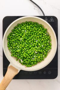 While frozen peas are typically boiled or steamed in a pot until done, this recipe does things a little differently. To help them maintain their buoyant, tender texture, we’re using a simple skillet instead!