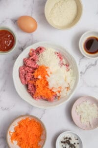 In a large bowl, combine ground beef, grated onion, breadcrumbs, grated carrot, garlic, egg, ketchup, Worcestershire sauce, salt, and pepper.
