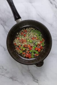 In the same pan, remove any excess oil except for 1 tablespoon and reduce heat to medium. Add garlic and chili, sautéing until fragrant, about 1 minute.