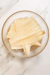 Soak the corn husks in hot water for an hour or until they are soft and pliable.