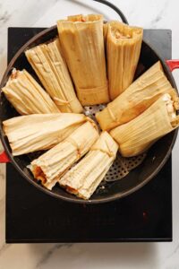 Place the tamales in a steamer basket, standing upright. Steam for about 60 to 90 minutes or until the masa separates easily from the husks.
