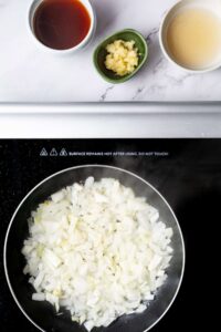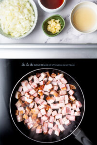 Add chopped onions to the skillet with retained bacon fat, cook until soft, then add minced garlic and sauté until fragrant.