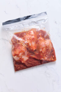 Set aside some of the marinade before putting the rest into the bag with the chicken – it can be used to baste the chicken while it cooks on the grill. Always discard the marinade you used to marinate the chicken initially.