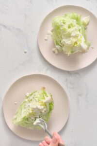 As far as nutrients go, the wedge salad is mostly fiber, but there’s a small amount of protein too, from the bacon and cheese. Keep in mind that those ingredients are also rich in fats, and many store-bought blue cheese dressings are, too. You can make it vegan by using vegan bacon, vegan dressing, and plant-based cheese.