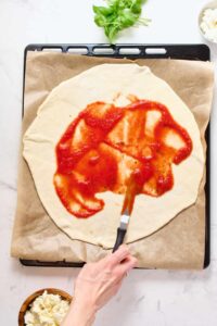 On a lightly floured surface, roll out the pizza dough into a 12-inch circle. Transfer to a parchment-lined baking sheet or a preheated pizza stone.