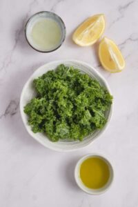 In a large bowl, combine the chopped kale with olive oil and lemon juice. Massage the kale with your hands for about 2-3 minutes until the leaves start to soften and wilt.