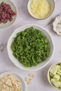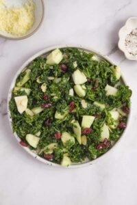 Next, the recipe calls for salty Parmesan, but if you’re feeling adventurous, I recommend swapping the Parmesan with crumbled goat cheese or feta. The creamier, clumpy cheeses are fun to play with in this recipe because of how they complement the crunchy apple and kale. You could also experiment with the kinds of nuts you use, replacing almonds with walnuts or pecans. With a sturdy base of kale, the sky’s the limit when it comes to fixings and toppings, so have fun with it!