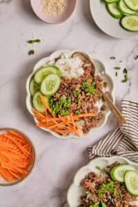 Serve the beef over cooked rice with shredded carrots and sliced cucumber. Garnish with remaining green onions and sesame seeds.