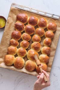 To make the dough ahead of time, simply let it rise first and then form into balls. Place dough balls on a sheet lined with parchment paper and store in the fridge overnight. When you’re ready to bake, take them out and let them rise a second time as they return to room temperature. Once baked, leftovers can be stored at room temperature for 2-3 days in zip-top bags or wrapped in plastic. For longer storage, place them in freezer-safe bags and freeze for up to 2 months. Thaw in the fridge overnight before enjoying cold. You can also reheat them in the oven for 5 minutes at 350°F.