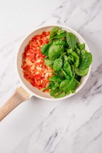 Cook onions, bell pepper, and spinach.