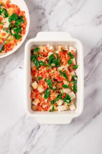 Assemble bread, vegetables, and cheese in a baking dish.