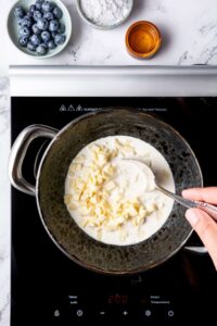 Gently melt the white chocolate with 1/2 cup of heavy cream in a heatproof bowl over a simmering pot of water (double boiler method), stirring until smooth.