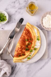 While this omelette is topped with a light smattering of green onions, you’re more than welcome to add even more color to it! Consider adding tomatoes, red onion, spinach, mushrooms, or broccolini. For more protein, you could add Sautéed Corn with Bacon. You could even stuff savory Breakfast Potatoes in there, complementing the creamy cottage cheese nicely. Choose a meat or veggie and make some different versions ’til you find your favorite!