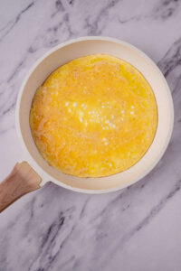 Pour the egg mixture into the pan, cooking for about 5 minutes until the eggs are mostly set.