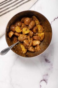 Since they are boiled, which removes a lot of starch, there’s no need to soak the potatoes beforehand. Just remember to give them a good scrub with clean water and a couple tablespoons of white vinegar before chopping! This removes any dirt or debris.