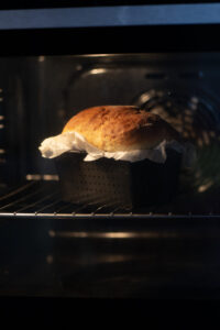 Punch down the dough, shape into a loaf, and let rise in a greased 9×5-inch loaf pan until puffy, at least 30 minutes.