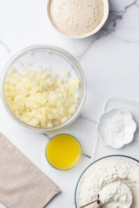 First, it’s important to choose a flour that will yield the best results. Bread flour is recommended for a sturdy, chewy texture, but you can also use all-purpose for a softer loaf. Next, make sure your water and milk are at the right temperature (110°F) as this will ensure the yeast activates, causing the bread to rise. To make it rise faster, you can preheat an oven to its lowest temperature, turn it off, and put the covered bowl of dough inside. Finally, here’s a fun fact: you can actually use leftover mashed potatoes from a previous dinner in this recipe! Just make sure it’s the equivalent of two medium potatoes, about one pound.